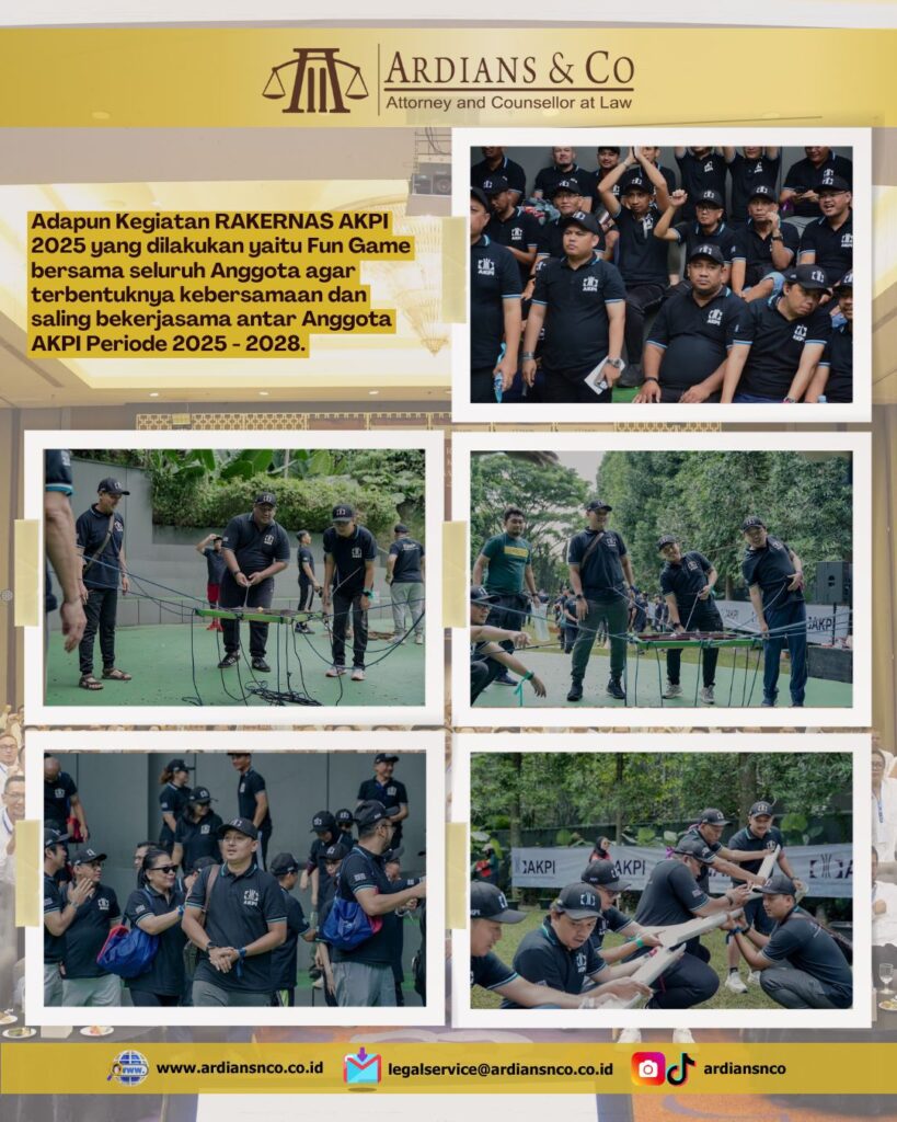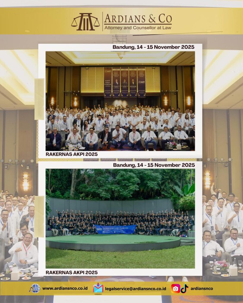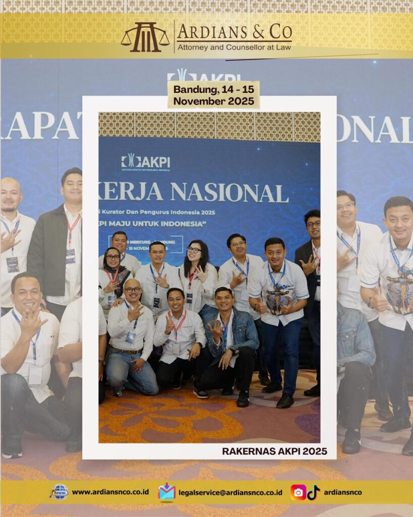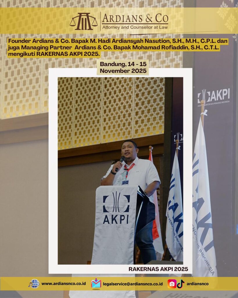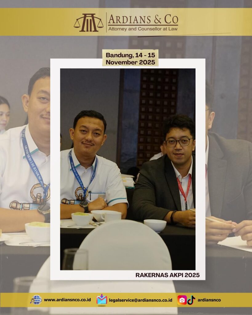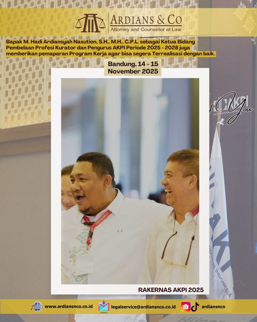 Pada tanggal 14–15 November 2025, Bapak M. Hadi Ardiansyah Nasution, S.H., M.H., C.P.L., selaku Founder Ardians & Co dan Ketua Bidang Pembelaan Profesi Kurator dan Pengurus AKPI Periode 2025–2028, bersama Bapak Mohamad Rofiaddin, S.H., C.T.L., selaku Managing Partner Ardians & Co dan Anggota Bidang Pembelaan Profesi Kurator dan Pengurus AKPI Periode 2025–2028, telah mengikuti Acara Rapat Kerja Nasional (RAKERNAS) 2025 yang diselenggarakan di Grand Mercure Setiabudi, Bandung.